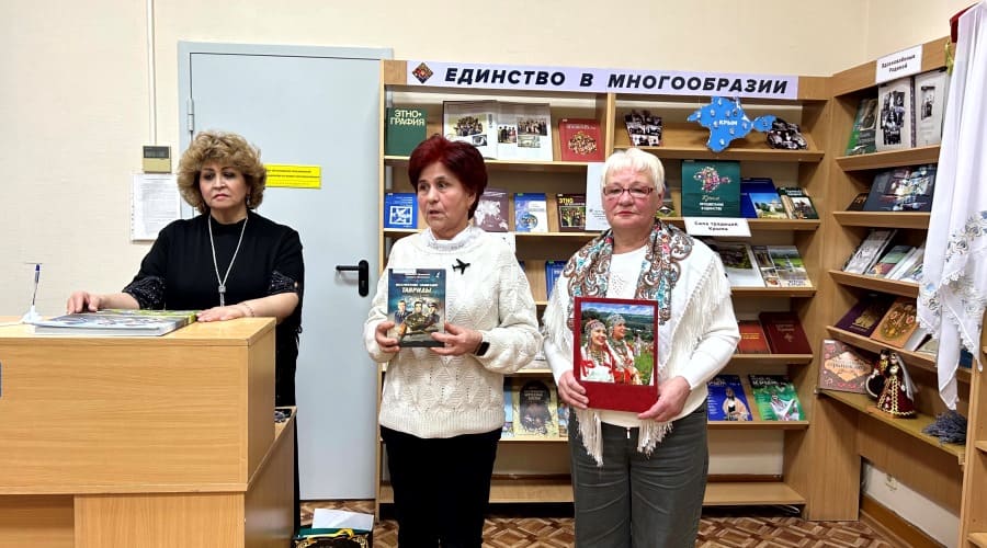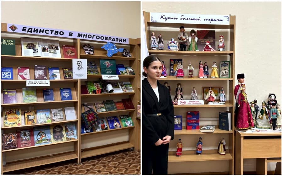 обзора тематической выставки-инсталляции «Единство в многообразии», на которой кроме книжно-иллюстративного материала, был представлен предметный ряд, хранящий дух народных традиций; открытие выставки кукол в национальных костюмах народов России «Куклы большой страны» из коллекции юной читательницы Гульсум Бекировой;