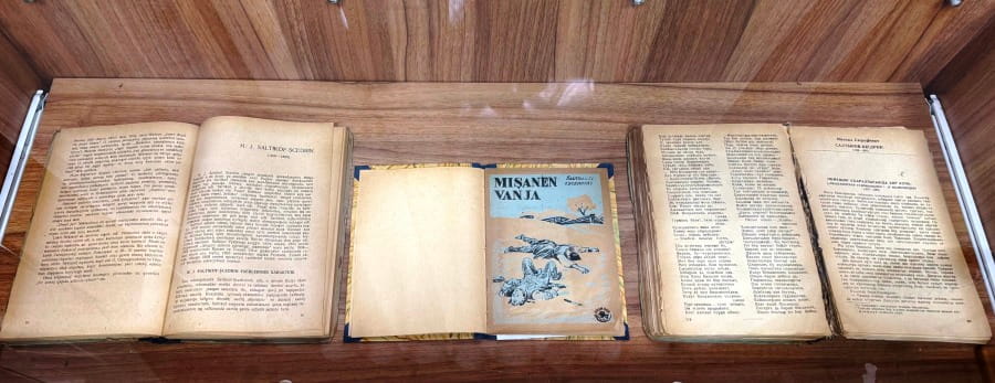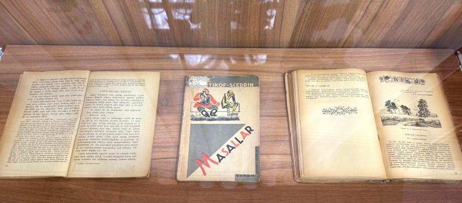 На выставке также представлены переводы на крымскотатарский язык отдельных произведений М. Е. Салтыкова-Щедрина, хранящиеся в фонде отдела редких книг, рукописных и архивных материалов. Среди них особый интерес представляют учебники и хрестоматии по литературе для общеобразовательных школ Крымской АССР, в которые включены такие переводы произведений писателя как «Акъылдане таш тешер балыкъ» («Премудрый пискарь»), «Лапек балыгъы – идеалист» («Карась – идеалист»), «Помещик къаралтысында бир кунь» (отрывок из произведения «Пошехонская старина»), «Тувгъан картинка» (Родные картинки).