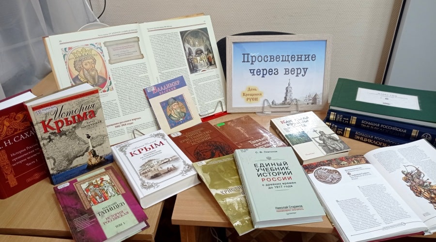 Ко Дню Крещения Руси в библиотеке имени Исмаила Гаспринского организована выставка-обозрение «Просвещение через веру», на которой представлены материалы об истории принятия христианства на Руси.